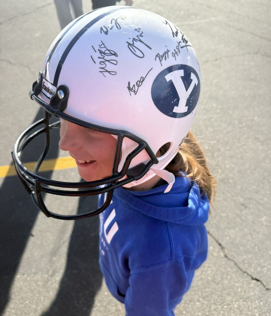 Skye had an exciting day at school. Her favorite BYU football players came and read to her class. She brought her helmet there for them to sign.