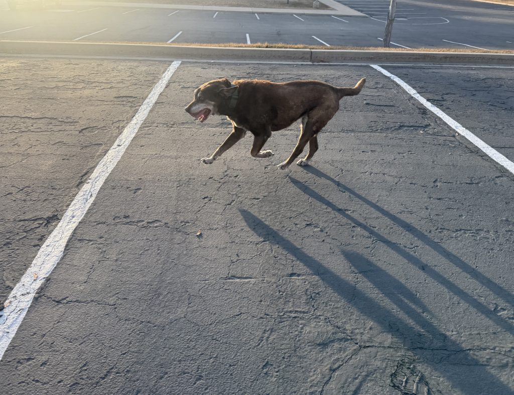 The church parking lot near us is empty most weekdays, and Beretta loves to run there. She is 14 years old and still pretty quick.