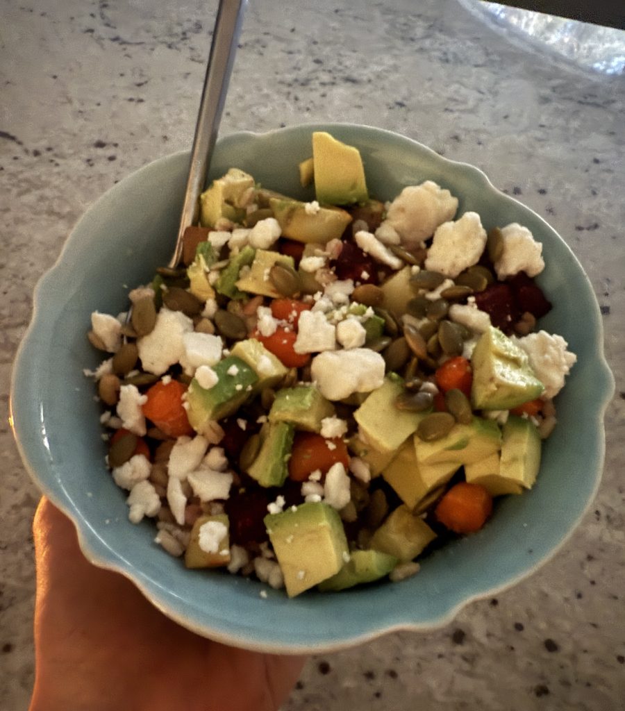 This. Bowl. Was. So. Good. I roasted carrots, sweet potatoes, and beets, and cooked barley (barley > rice in my opinion). I added the barley and veggies together with a bit of oil and balsamic vinegar, along with feta, pumpkin seeds, and avocado. I’ll be eating this on repeat for a while.