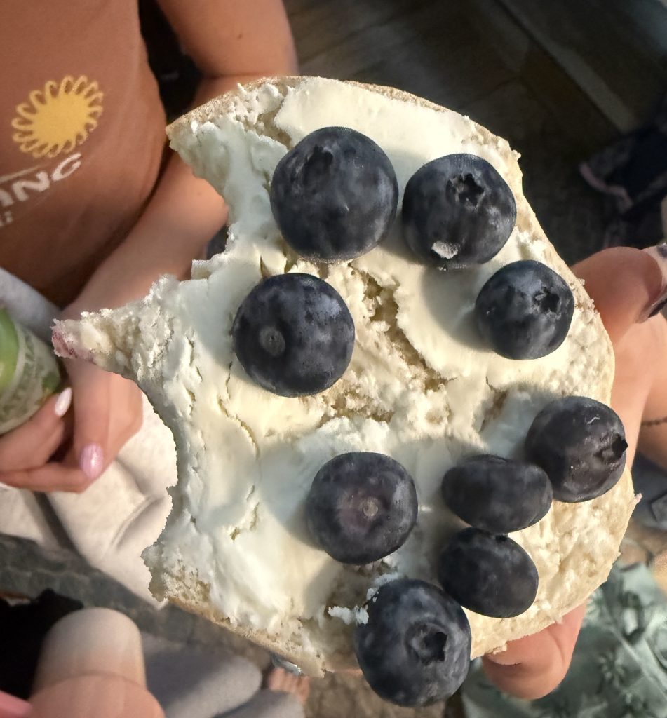 *Curly taught us the joy of a toasted bagel with plain cream cheese and blueberries. Try it.
