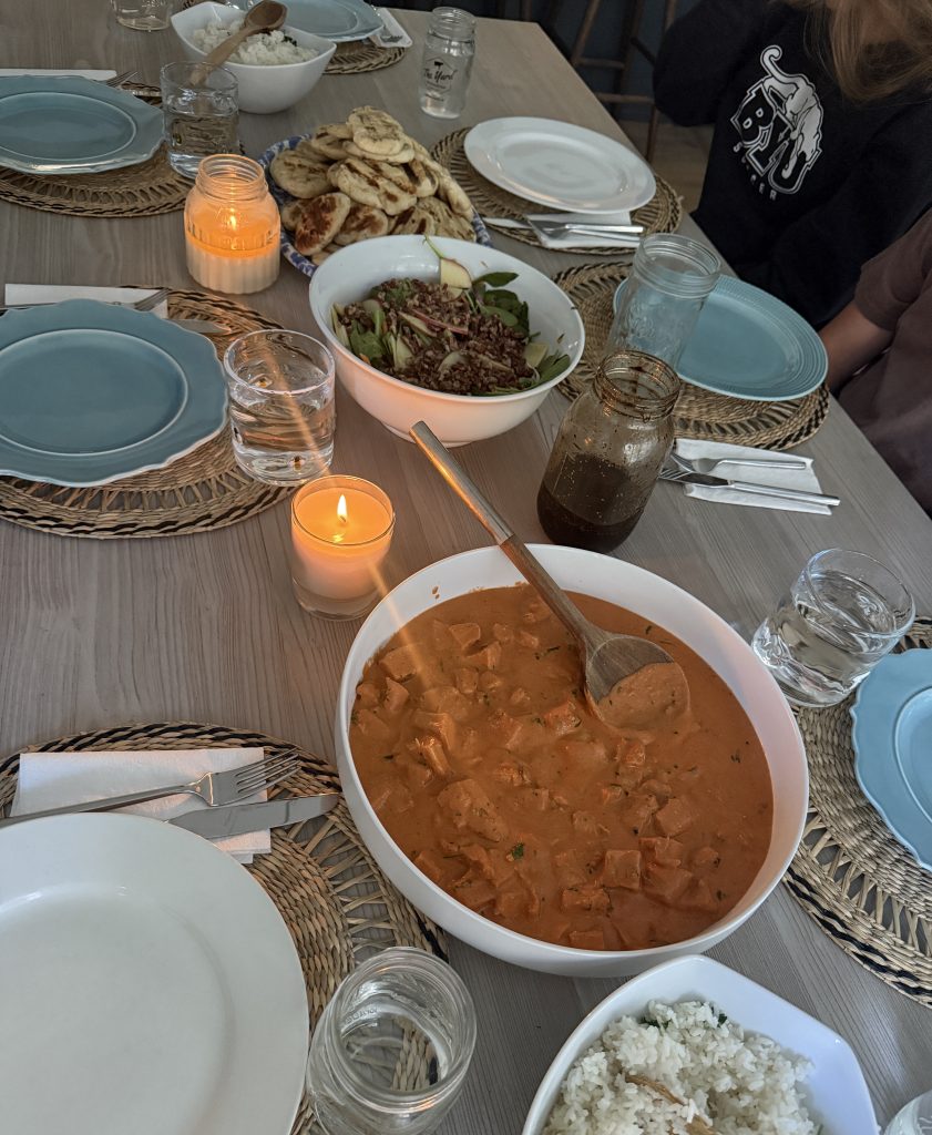 Curly asked if she could make dinner for us on Friday night. She loves to cook, and we love to eat. It was one of the best meals I’ve ever had. Knox had a friend over for dinner, too, and we all sat there and talked for so long. Tikka Masala recipe! Her salad was made of spinach, thinly sliced apples, candied pecans, red onions, carrots, and this dressing.