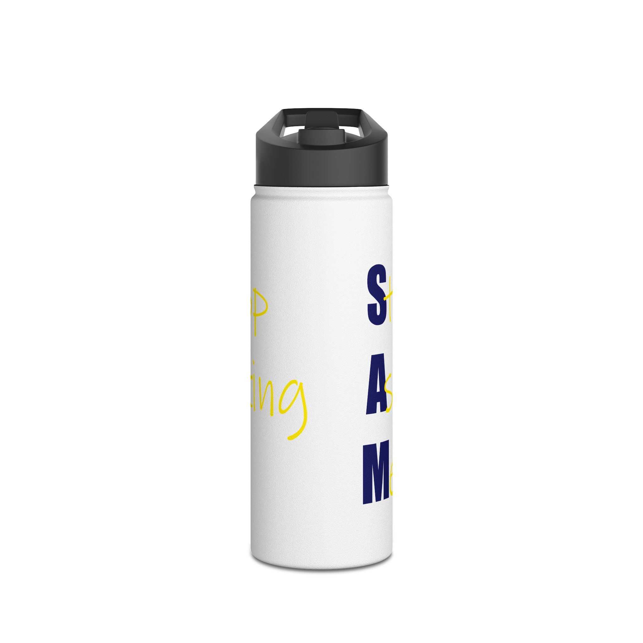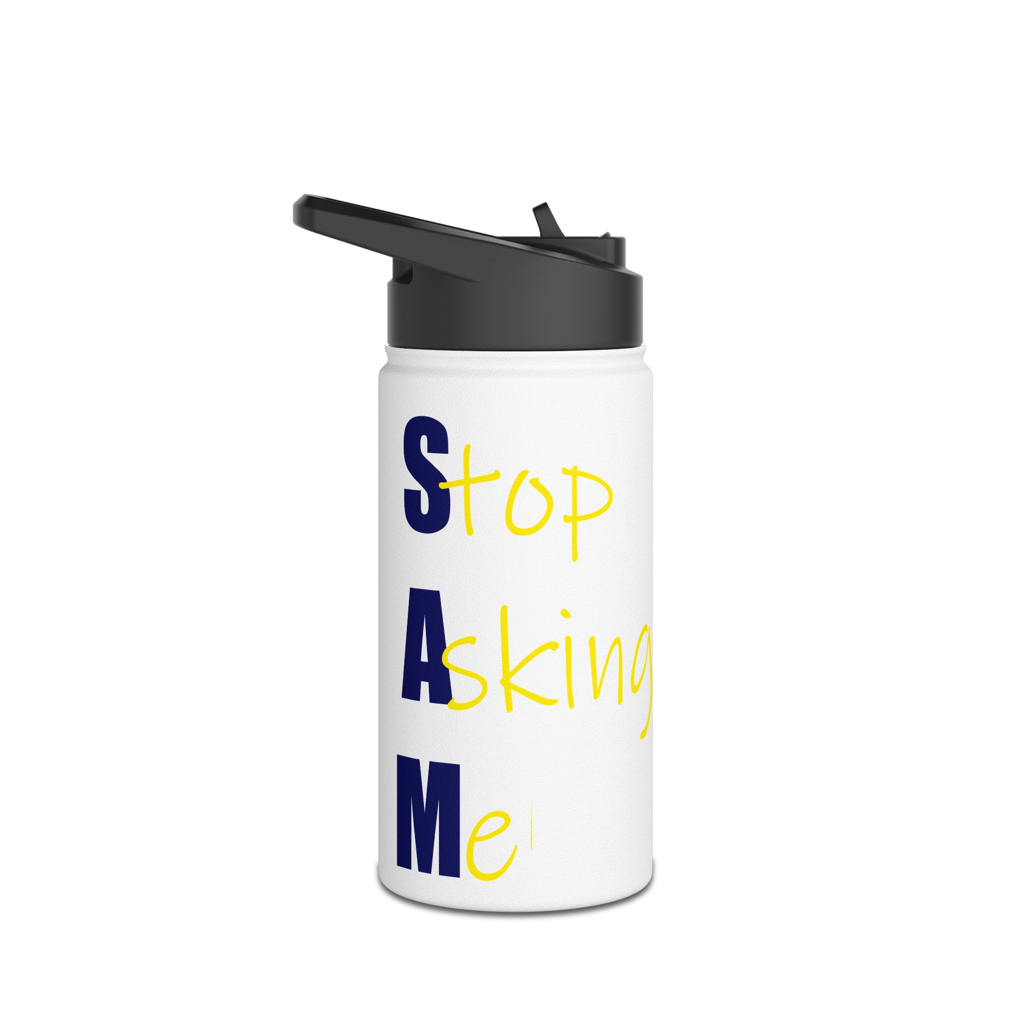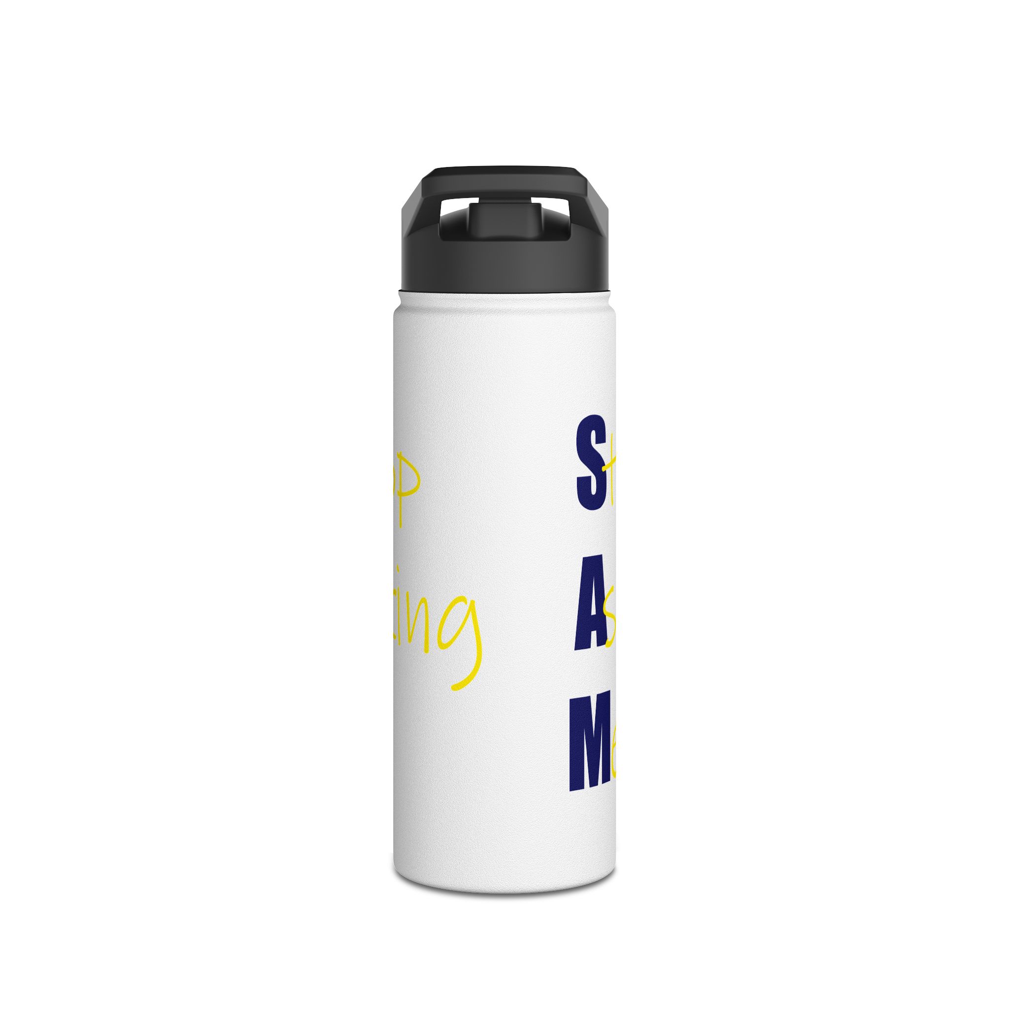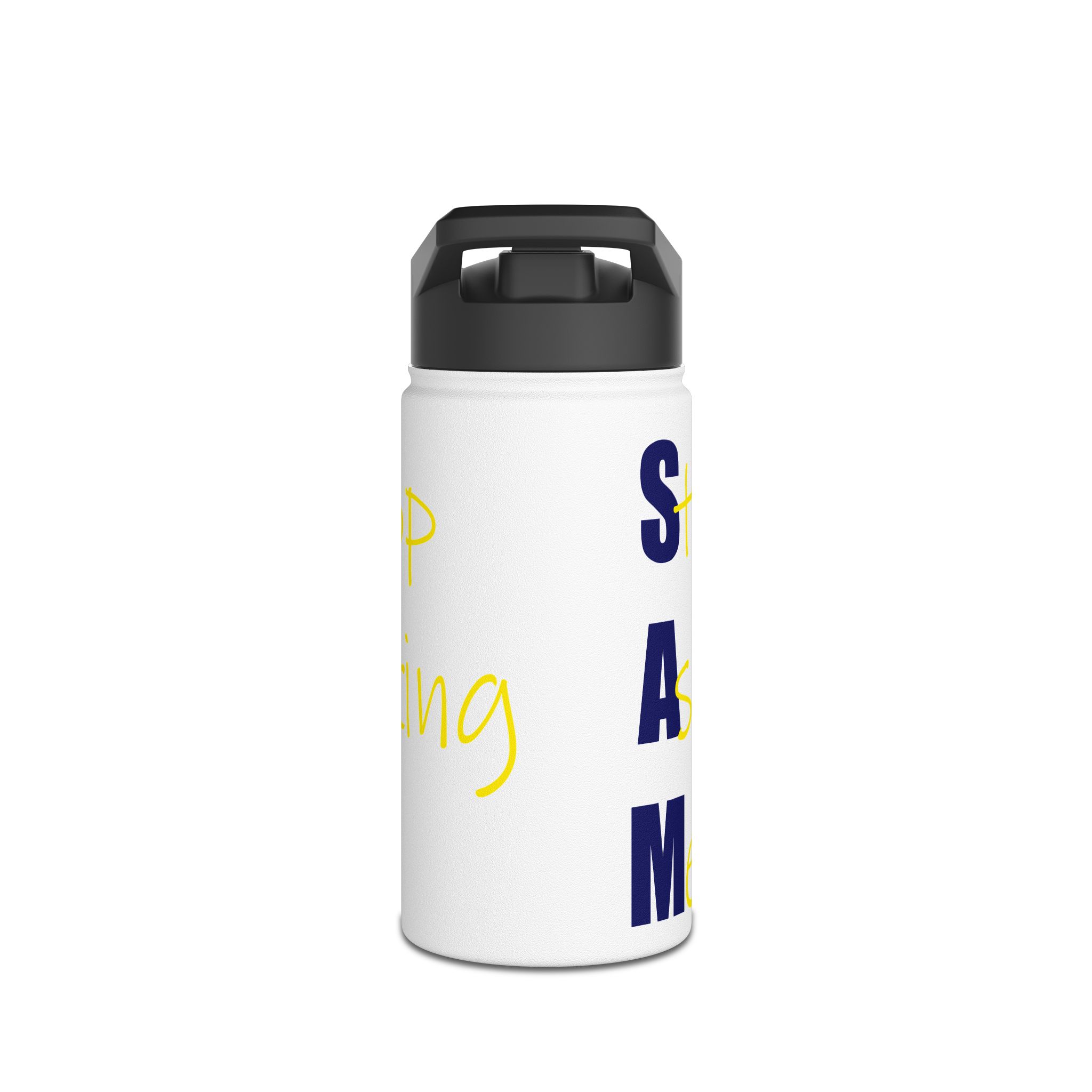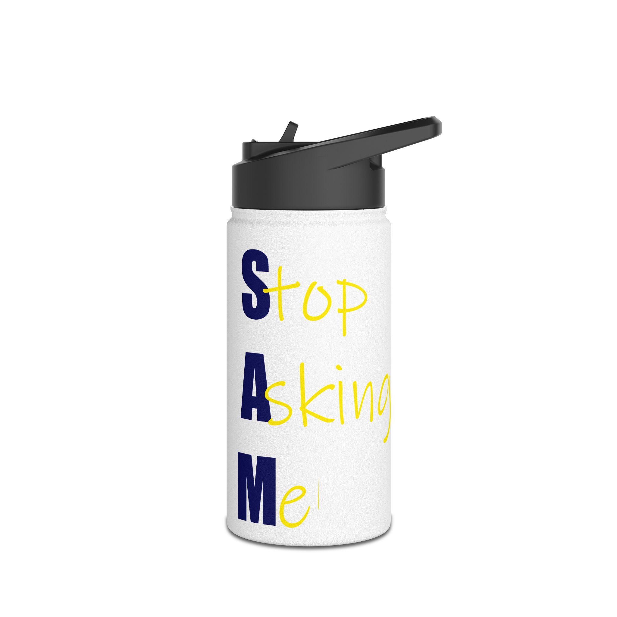 Stainless Steel Water Bottle — Bold Vertical Text Design (yellow script & navy block)